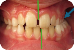 Dadurch stehen die unteren Zähne auf der Seite weiter außen als die oberen. Der Unterkiefer ist zu einer Seite verschoben. Diesen Biss nennen wir Kreuzbiss, da sich ab einem bestimmten Zahn – hier Eckzahn – die Seiten kreuzen. Zusätzlich ist die Mittellinie zur Seite des Kreuzbisses verschoben (grüne Striche).